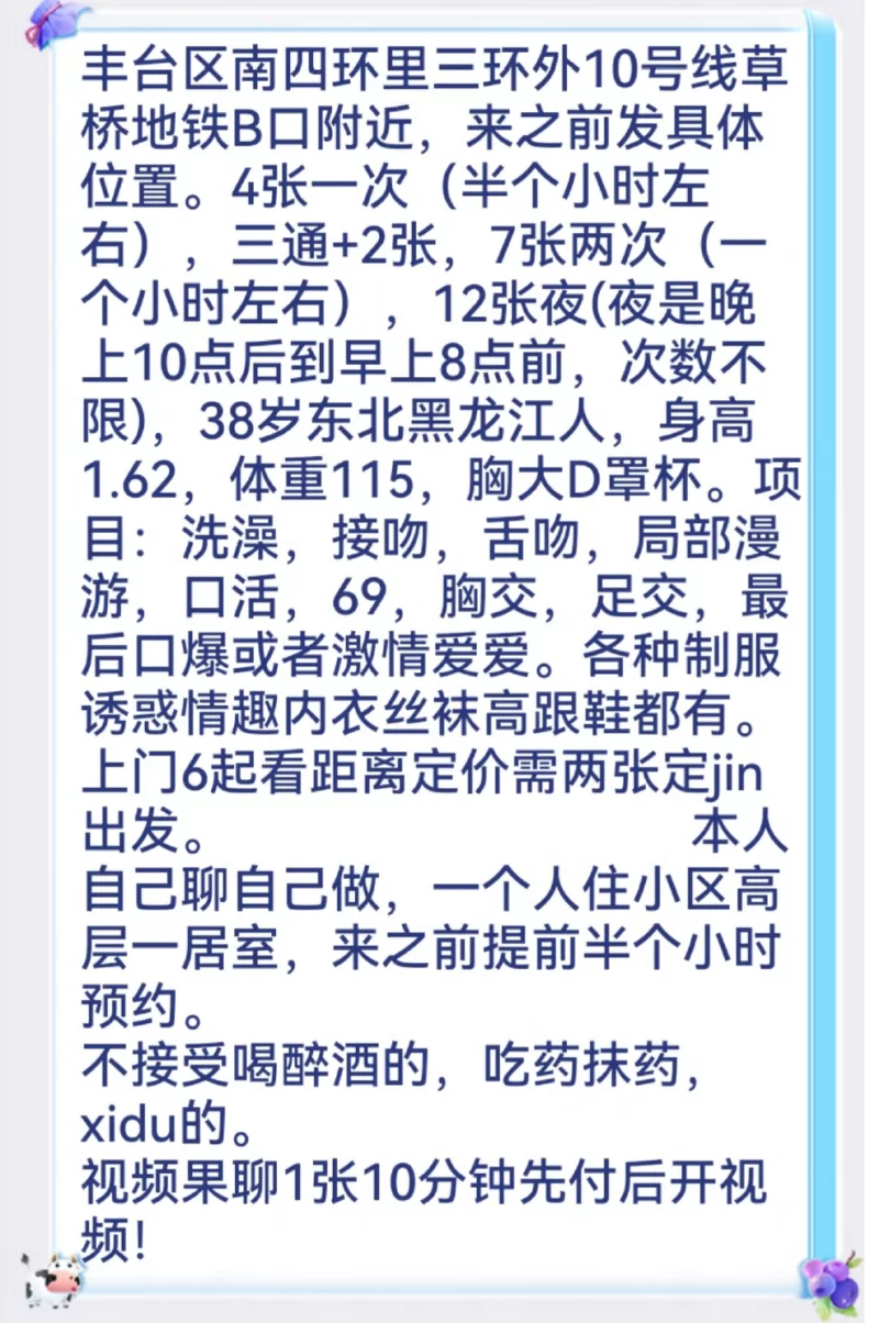 威客管理提示:要求付定金 保证金的,总之提前要钱的都是骗子 千万不要被照片所蒙蔽,说30了,实际我看着45上下,相册里写了一大堆服务,实际一大部分都没有,有的几个也是草草了事,而且不太配合,动作表情极其夸张,奶头黑的像煤球,忍着干完的,出了门想起来想吐,而且废话很多这是年龄大的人通病,大家看好了不要再上当,就这还敢要500,特么的最近倒霉总碰上这种老b,威客上还有一堆人写她好的严重怀疑是枪手。
